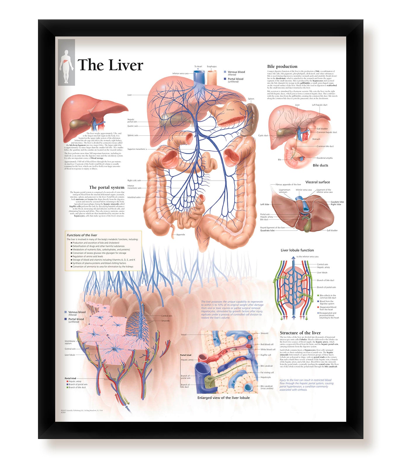 Framed informational medical poster of the Liver including colorful diagram. Educational material that is perfect for use in school classrooms or doctors offices. For an extra boost of instructional decor, this convenient poster diagram by WallsThatSpeak is a great way to go. The poster measures 22" x 28" and comes ready to mount in a sleek black frame. Don’t worry about having to find a classy frame because we've got you covered. This poster is printed on high-quality, ultra thin paper stock as opposed to rough poster board or stiff cardstock. This yields a clearer, glossier image for more defined display. Each poster is printed only after an order has been placed. Because we don't mass print any of our posters, we save a fortune on paper and ink, which allows us to provide our customers with quality products at a lower cost — all while being kind to the planet. Our colorful posters feature highly detailed diagrams of the human body parts anatomy. These posters are lightweight and easy to hang. Each frame comes complete with hanging hardware and tough cardboard backing to keep the poster safe and secure from rips, wrinkles, and tears. Our frames are made with matte finish acrylic materials for a subtle, classic feel. This poster from WallsThatSpeak is perfect for any room, from office spaces and waiting rooms to classrooms at the middle and high school level or even collegiate campuses and medical schools. All of our products are printed in the United States! Get your new informational parts of the body anatomy poster today!