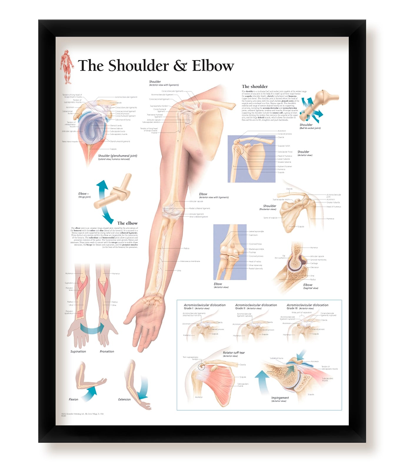 Framed informational medical poster of the Shoulder and Elbow including colorful diagram. Educational material that is perfect for use in school classrooms or doctors offices. For an extra boost of instructional decor, this convenient poster diagram by WallsThatSpeak is a great way to go. The poster measures 22" x 28" and comes ready to mount in a sleek black frame. Don’t worry about having to find a classy frame because we've got you covered. This poster is printed on high-quality, ultra thin paper stock as opposed to rough poster board or stiff cardstock. This yields a clearer, glossier image for more defined display. Each poster is printed only after an order has been placed. Because we don't mass print any of our posters, we save a fortune on paper and ink, which allows us to provide our customers with quality products at a lower cost — all while being kind to the planet. Our colorful posters feature highly detailed diagrams of the human body parts anatomy. These posters are lightweight and easy to hang. Each frame comes complete with hanging hardware and tough cardboard backing to keep the poster safe and secure from rips, wrinkles, and tears. Our frames are made with matte finish acrylic materials for a subtle, classic feel. This poster from WallsThatSpeak is perfect for any room, from office spaces and waiting rooms to classrooms at the middle and high school level or even collegiate campuses and medical schools. All of our products are printed in the United States! Get your new informational parts of the body anatomy poster today!
