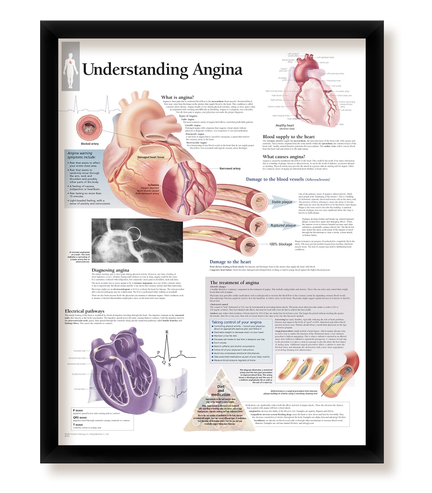 Framed informational medical poster, Understanding Angina, including colorful diagram. Educational material that is perfect for use in school classrooms or doctors offices. For an extra boost of instructional decor, this convenient poster diagram by WallsThatSpeak is a great way to go. The poster measures 22" x 28" and comes ready to mount in a sleek black frame. Don’t worry about having to find a classy frame because we've got you covered. This poster is printed on high-quality, ultra thin paper stock as opposed to rough poster board or stiff cardstock. This yields a clearer, glossier image for more defined display. Each poster is printed only after an order has been placed. Because we don't mass print any of our posters, we save a fortune on paper and ink, which allows us to provide our customers with quality products at a lower cost — all while being kind to the planet. Our colorful posters feature highly detailed diagrams of the human body parts anatomy. These posters are lightweight and easy to hang. Each frame comes complete with hanging hardware and tough cardboard backing to keep the poster safe and secure from rips, wrinkles, and tears. Our frames are made with matte finish acrylic materials for a subtle, classic feel. This poster from WallsThatSpeak is perfect for any room, from office spaces and waiting rooms to classrooms at the middle and high school level or even collegiate campuses and medical schools. All of our products are printed in the United States! Get your new informational parts of the body anatomy poster today!