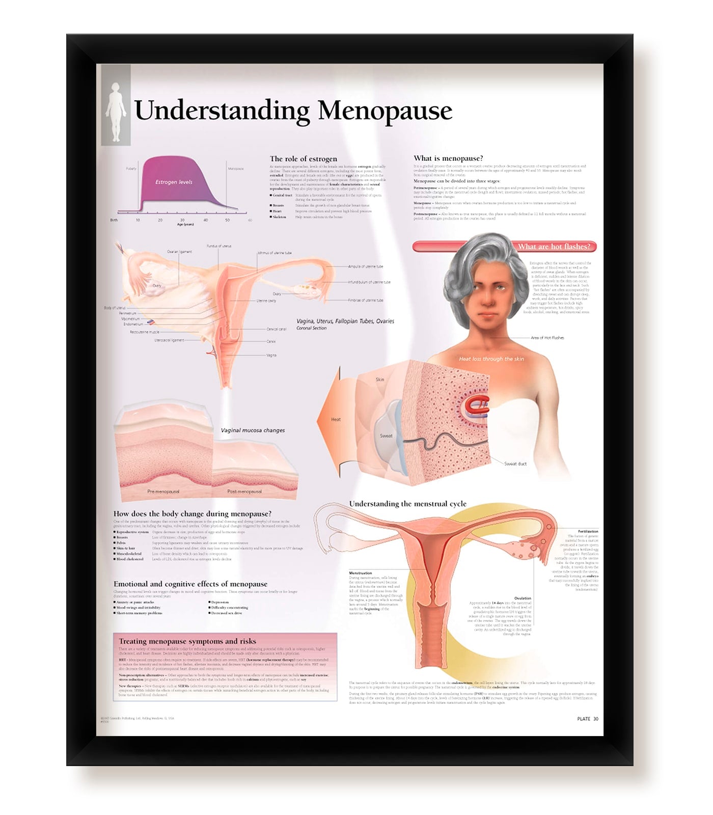 Framed informational medical poster, Understanding Menopause, including colorful diagram. Educational material that is perfect for use in school classrooms or doctors offices. For an extra boost of instructional decor, this convenient poster diagram by WallsThatSpeak is a great way to go. The poster measures 22" x 28" and comes ready to mount in a sleek black frame. Don’t worry about having to find a classy frame because we've got you covered. This poster is printed on high-quality, ultra thin paper stock as opposed to rough poster board or stiff cardstock. This yields a clearer, glossier image for more defined display. Each poster is printed only after an order has been placed. Because we don't mass print any of our posters, we save a fortune on paper and ink, which allows us to provide our customers with quality products at a lower cost — all while being kind to the planet. Our colorful posters feature highly detailed diagrams of the human body parts anatomy. These posters are lightweight and easy to hang. Each frame comes complete with hanging hardware and tough cardboard backing to keep the poster safe and secure from rips, wrinkles, and tears. Our frames are made with matte finish acrylic materials for a subtle, classic feel. This poster from WallsThatSpeak is perfect for any room, from office spaces and waiting rooms to classrooms at the middle and high school level or even collegiate campuses and medical schools. All of our products are printed in the United States! Get your new informational parts of the body anatomy poster today!