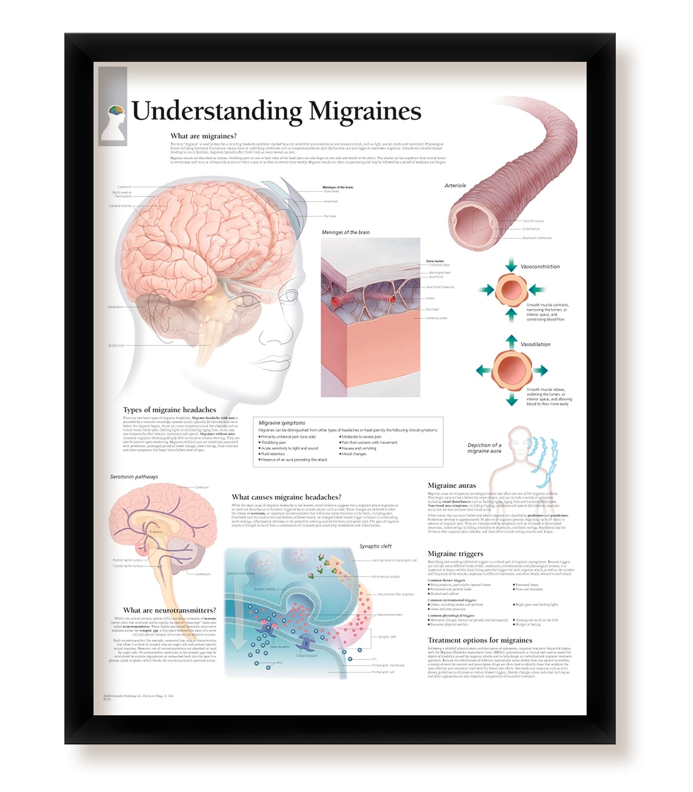 Framed informational medical poster, Understanding Migraines, including colorful diagram. Educational material that is perfect for use in school classrooms or doctors offices. For an extra boost of instructional decor, this convenient poster diagram by WallsThatSpeak is a great way to go. The poster measures 22" x 28" and comes ready to mount in a sleek black frame. Don’t worry about having to find a classy frame because we've got you covered. This poster is printed on high-quality, ultra thin paper stock as opposed to rough poster board or stiff cardstock. This yields a clearer, glossier image for more defined display. Each poster is printed only after an order has been placed. Because we don't mass print any of our posters, we save a fortune on paper and ink, which allows us to provide our customers with quality products at a lower cost — all while being kind to the planet. Our colorful posters feature highly detailed diagrams of the human body parts anatomy. These posters are lightweight and easy to hang. Each frame comes complete with hanging hardware and tough cardboard backing to keep the poster safe and secure from rips, wrinkles, and tears. Our frames are made with matte finish acrylic materials for a subtle, classic feel. This poster from WallsThatSpeak is perfect for any room, from office spaces and waiting rooms to classrooms at the middle and high school level or even collegiate campuses and medical schools. All of our products are printed in the United States! Get your new informational parts of the body anatomy poster today!