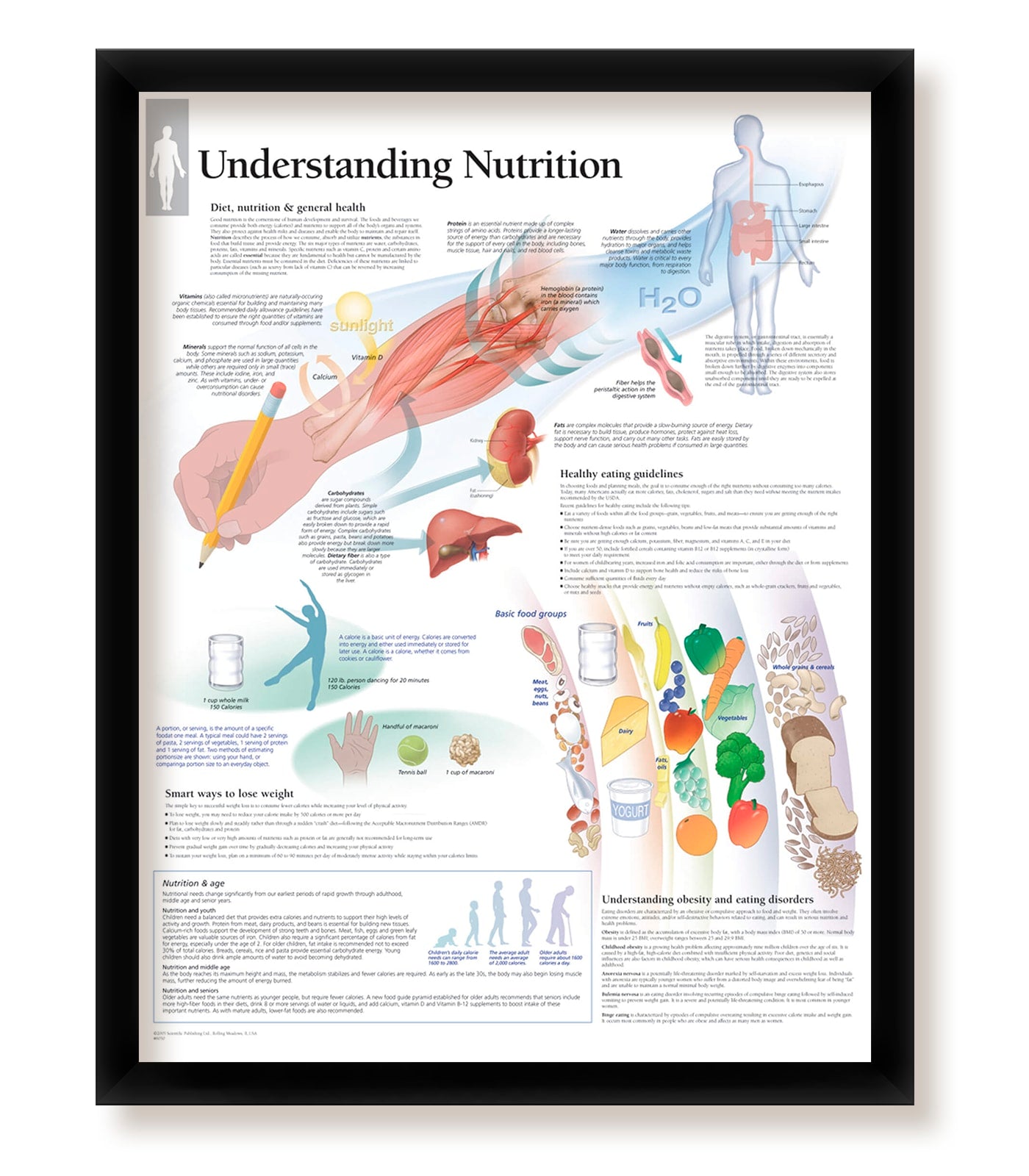 Framed informational medical poster, Understanding Nutrition, including colorful diagram. Educational material that is perfect for use in school classrooms or doctors offices. For an extra boost of instructional decor, this convenient poster diagram by WallsThatSpeak is a great way to go. The poster measures 22" x 28" and comes ready to mount in a sleek black frame. Don’t worry about having to find a classy frame because we've got you covered. This poster is printed on high-quality, ultra thin paper stock as opposed to rough poster board or stiff cardstock. This yields a clearer, glossier image for more defined display. Each poster is printed only after an order has been placed. Because we don't mass print any of our posters, we save a fortune on paper and ink, which allows us to provide our customers with quality products at a lower cost — all while being kind to the planet. Our colorful posters feature highly detailed diagrams of the human body parts anatomy. These posters are lightweight and easy to hang. Each frame comes complete with hanging hardware and tough cardboard backing to keep the poster safe and secure from rips, wrinkles, and tears. Our frames are made with matte finish acrylic materials for a subtle, classic feel. This poster from WallsThatSpeak is perfect for any room, from office spaces and waiting rooms to classrooms at the middle and high school level or even collegiate campuses and medical schools. All of our products are printed in the United States! Get your new informational parts of the body anatomy poster today!
