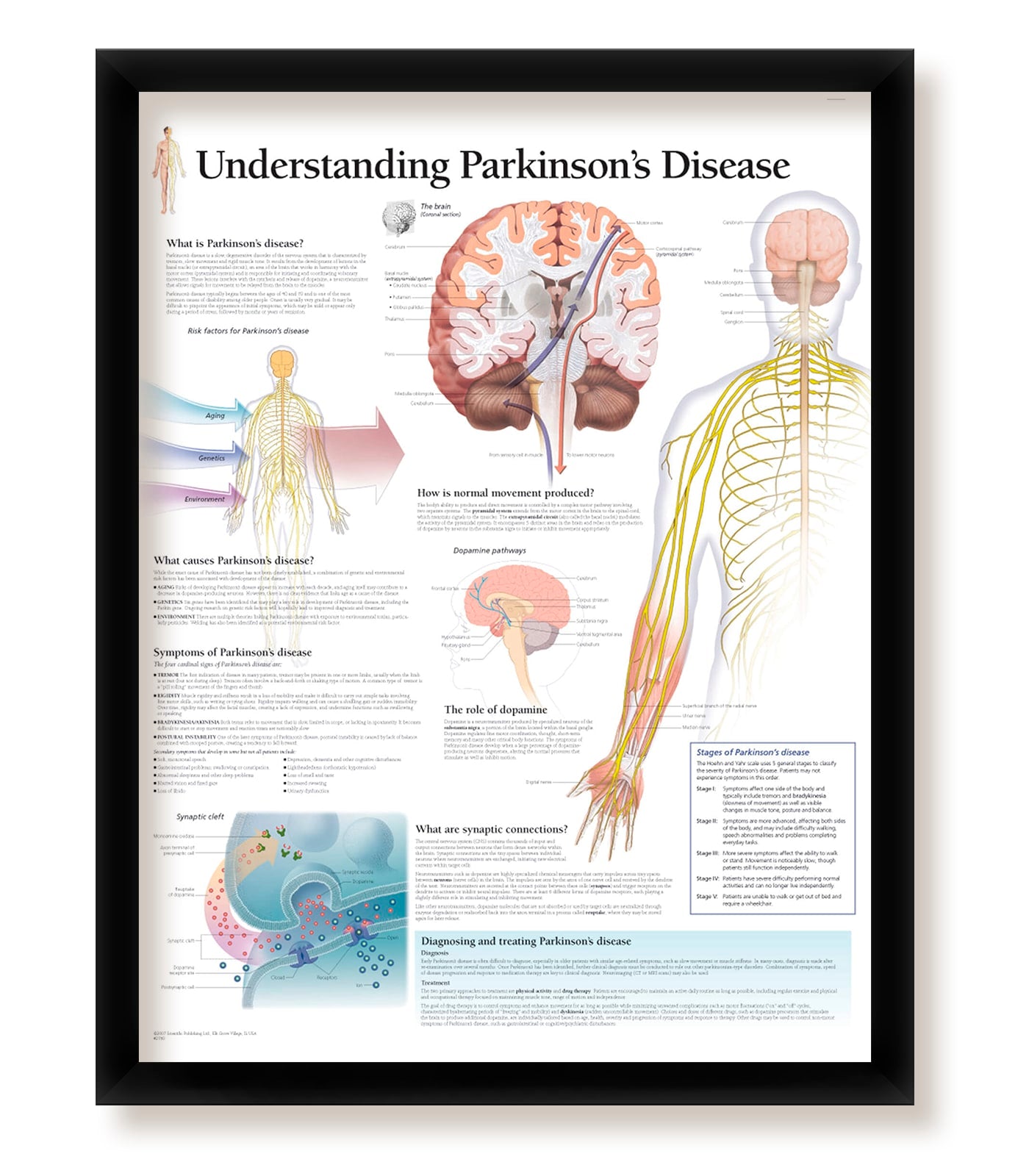 Framed informational medical poster, Understanding Parkinson’s Disease including colorful diagram. Educational material that is perfect for use in school classrooms or doctors offices. For an extra boost of instructional decor, this convenient poster diagram by WallsThatSpeak is a great way to go. The poster measures 22" x 28" and comes ready to mount in a sleek black frame. Don’t worry about having to find a classy frame because we've got you covered. This poster is printed on high-quality, ultra thin paper stock as opposed to rough poster board or stiff cardstock. This yields a clearer, glossier image for more defined display. Each poster is printed only after an order has been placed. Because we don't mass print any of our posters, we save a fortune on paper and ink, which allows us to provide our customers with quality products at a lower cost — all while being kind to the planet. Our colorful posters feature highly detailed diagrams of the human body parts anatomy. These posters are lightweight and easy to hang. Each frame comes complete with hanging hardware and tough cardboard backing to keep the poster safe and secure from rips, wrinkles, and tears. Our frames are made with matte finish acrylic materials for a subtle, classic feel. This poster from WallsThatSpeak is perfect for any room, from office spaces and waiting rooms to classrooms at the middle and high school level or even collegiate campuses and medical schools. All of our products are printed in the United States! Get your new informational parts of the body anatomy poster today!